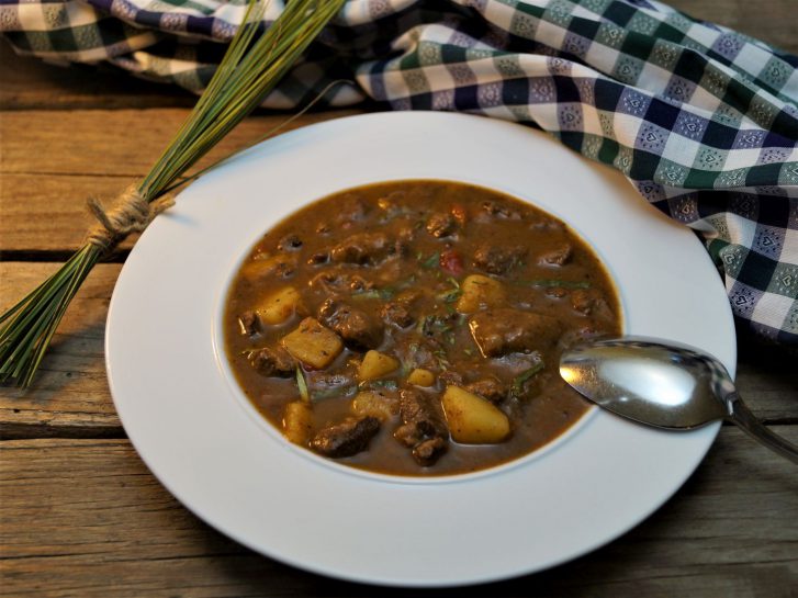 Zutaten: Wildfleisch, Brühe, Zwiebeln, Tomatenmark, Kümmel, Knoblauch, Kartoffeln, Paprika, Gewürze